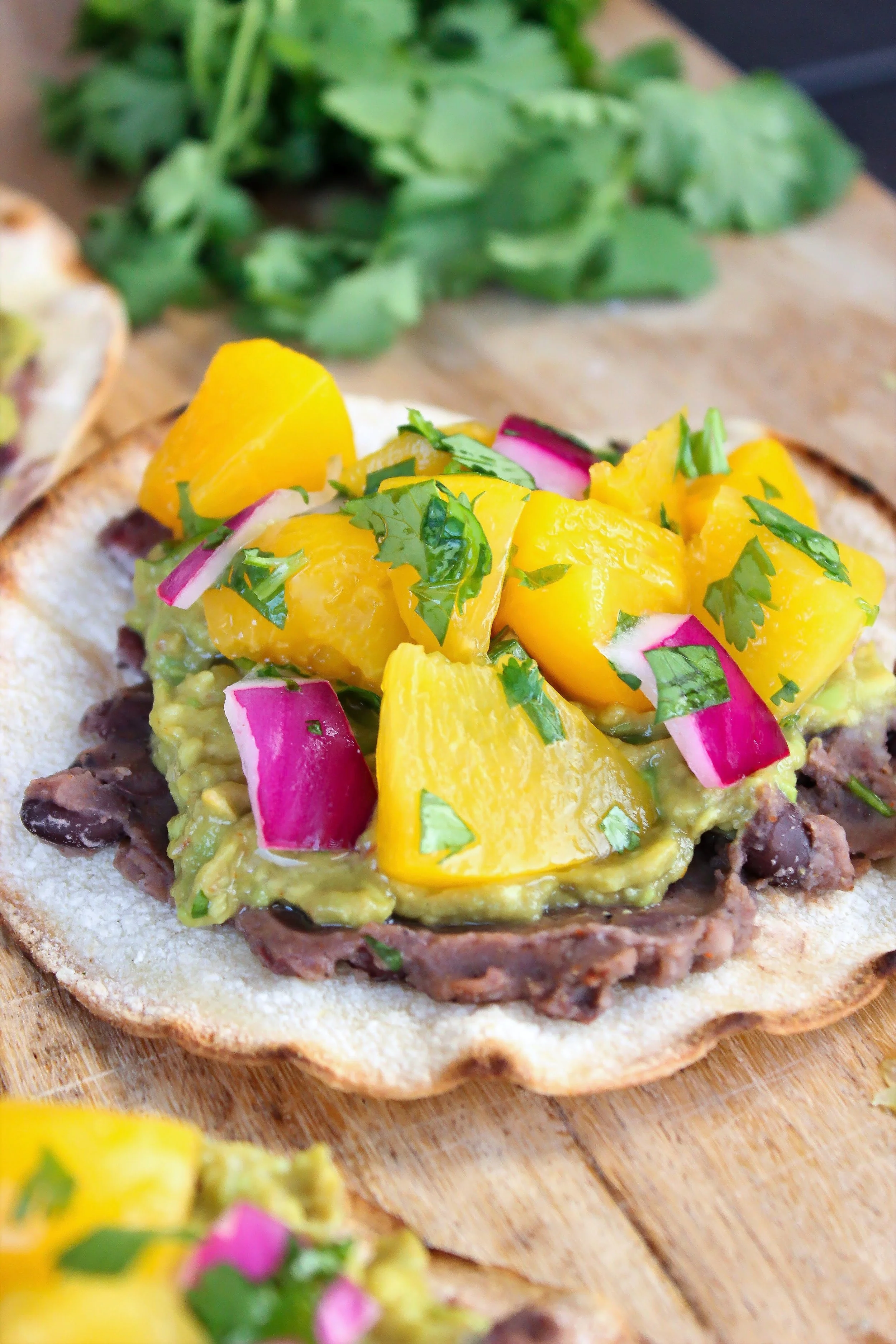 To assemble, spread 1/4 of the avocado or guacamole onto the bottom of the toasted tortilla (tostado). Sprinkle with a pinch of salt and pepper. Next, divide the black beans evenly between the 4 tostados. Then, divide the peach salsa evenly on top. Serve and enjoy immediately.